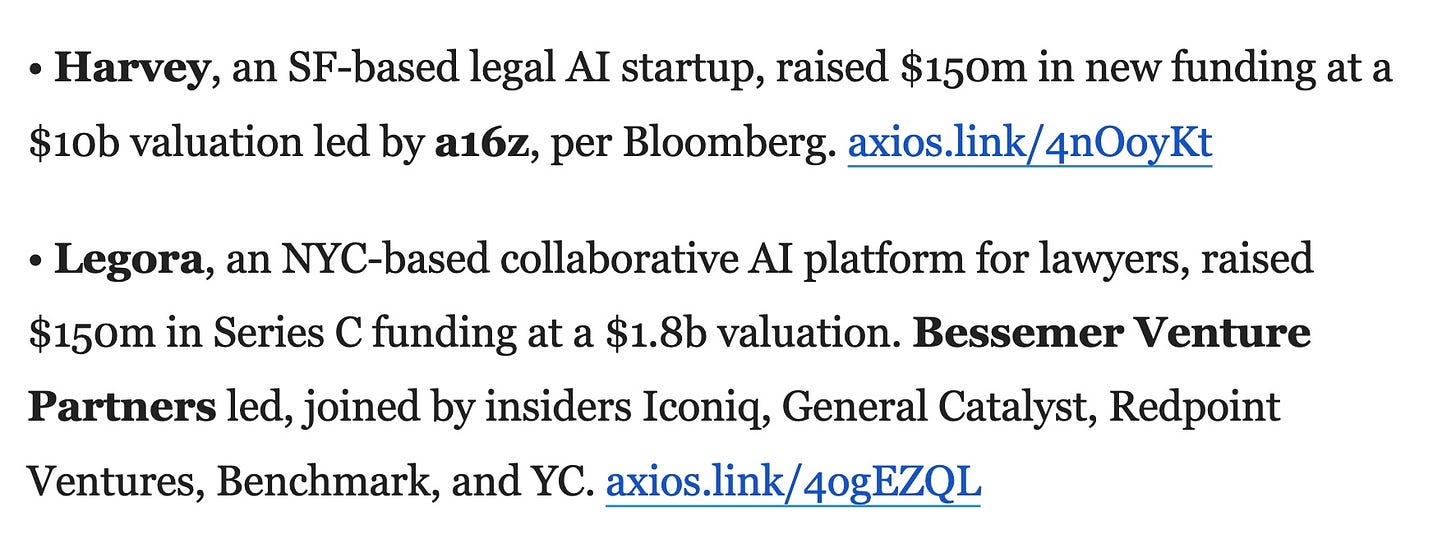 Legal AI Faceoff: This week was a big one for legal AI announcements, with Harvey and Legora both announcing $150MM rounds (although Harvey’s was done at 5x the valuation). Many of the fastest-growing vertical AI platforms sell high-ACV, enterprise products to professional services firms who are facing pressure to adopt AI to remain competitive. The rare back-to-back announcement screenshot below is courtesy of yesterday’s Axios Pro-Rata: